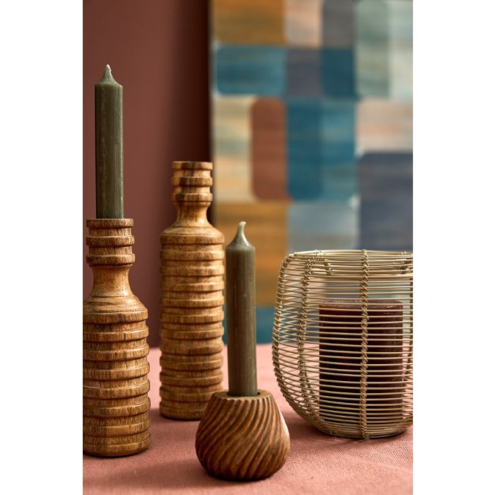 Kandelaar Kaya is 18 cm hoog, slank en elegant, met prachtig houtsnijwerk dat elk exemplaar uniek maakt.